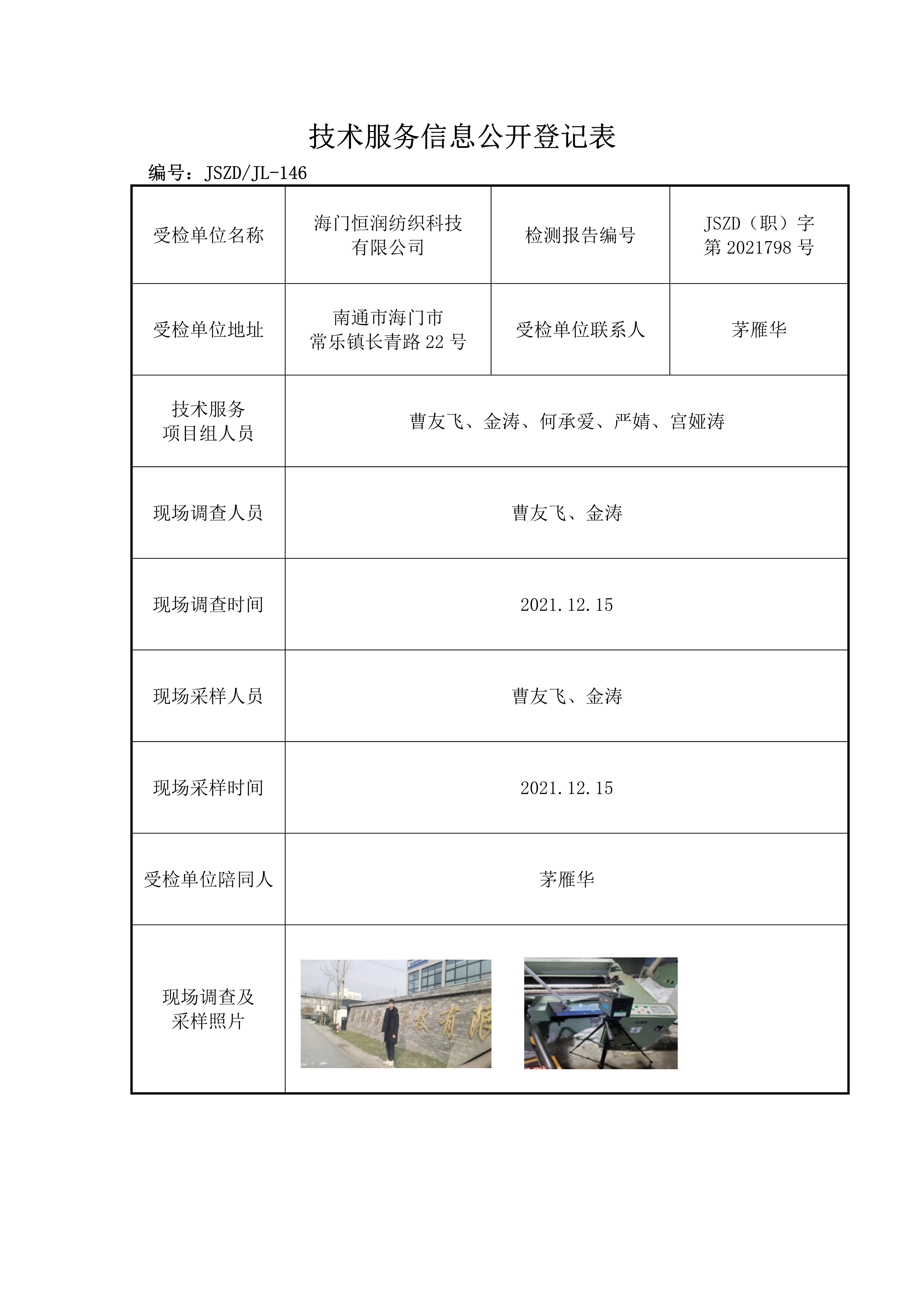 2021-2022南通地區(qū)檢驗檢測項目公開——正大JSZD(職)字第2021798號海門恒潤紡織科技有限公司職業(yè)病危害因素檢測報告